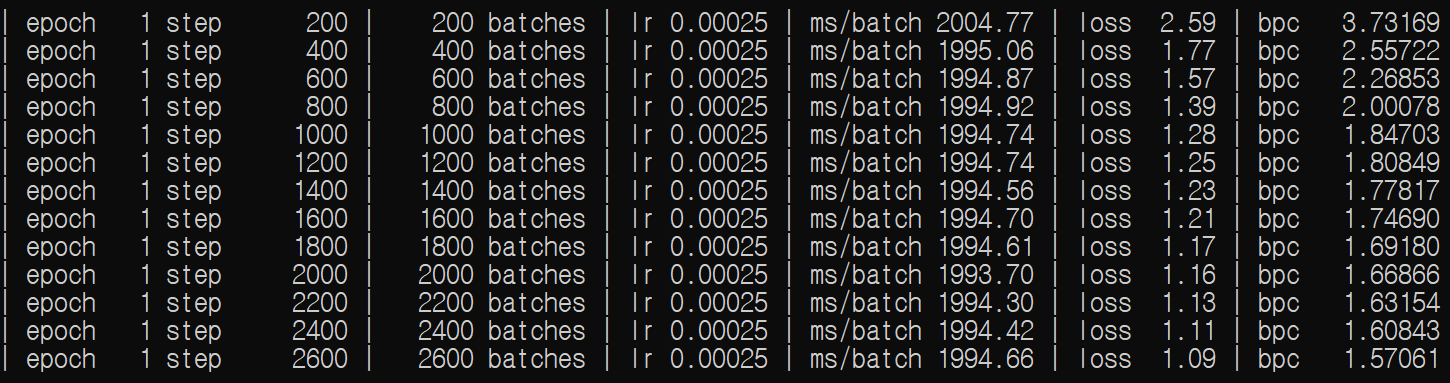 bpc가 성능이다. loss는 꾸준히 줄지만 슬슬 수렴하기 시작한다.
