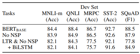 BERT의 2가지 학습방법(MLM, NSP)을 제거해보며 결과를 비교해보았다. No NSP는 MLM만 적용한 방식, LTR & No NSP는 MLM 대신 left-to-right 언어모델 방식으로 학습한 방식이다. left-to-right 방식보다 MLM 방식이 엄청난 성능 향상을 가져왔다. NSP 유무도 NLI 계열의 문제에서 성능이 많이 하락하였다. NSP가 문장간의 논리 구조를 학습하는데 중요함을 알 수 있다.