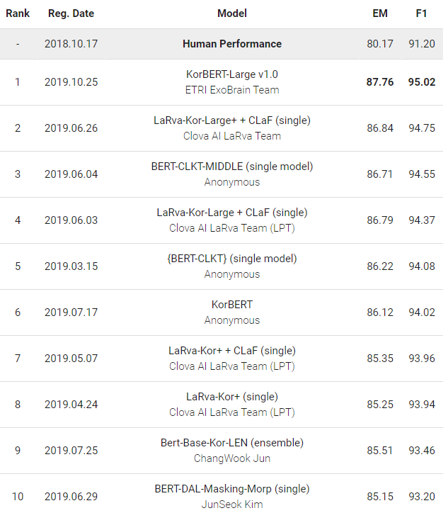 아래 그림은 한국어 QA 대회인 KorQuAD 대회의 성적이다. 19년 10월 현재 1위부터 10위까지 모든 대회 참가자들이 BERT 모델을 이용하여 상위권을 기록하고 있다. 이 모델은 과연 뭐길래 사람의 성능(Human performance)조차 능가하는 것일까?