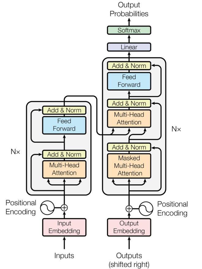 BERT 모델은 Transformer [1]를 기반으로 한다. 위 그림은 Transformer 모델 구조로 인코더-디코더 모델이며 번역 도메인에서 최고 성능을 기록하였다. 기존 인코더-디코더 모델들과 다르게 Transformer는 CNN, RNN을 이용하지 않고 Self-attention이라는 개념을 도입하였다. BERT는 Transformer의 인코더-디코더 중 인코더만 사용하는 모델이다.