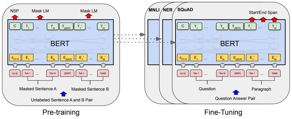 기존의 방법들은 보통 좌-우(left-to-right)로 학습하거나 우-좌(right-to-left)로 학습하는 방식이다. 이 방식들은 입력의 다음단어를 예측하는데 좋은 성능을 발휘한다. 하지만 BERT는 이 방식들과 다르게 언어의 특성을 잘 학습하도록 2가지 방식, MLM(Masked Language Model)과 NSP(Next Sentence Prediction)을 사용한다. 기존 방식인 좌-우 언어모델과 비교하여 MLM 방식이 훨씬 좋은 성능을 기록하였다.