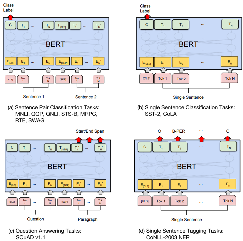 BERT를 각 Task에 쓰기위한 예시는 위 그림과 같다. (a)는 문장 쌍 분류 문제로 두 문장을 하나의 입력으로 넣고 두 문장간 관계를 구한다. (b)는 한 문장을 입력으로 넣고 문장의 종류를 분류하는 문제이다. (c)는 문장이나 문단 내에서 원하는 정답 위치의 시작과 끝을 구한다. (d)는 입력 문장 Token들의 개체명(Named entity recognigion)을 구하거나 품사(Part-of-speech tagging) 를 구하는 문제이다. 다른 Task들과 다르게 입력의 모든 Token들에 대해 결과를 구한다.