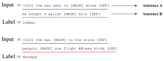 NSP는 두 문장이 주어졌을 때 두 번째 문장이 첫 번째 문장의 바로 다음에 오는 문장인지 여부를 예측하는 방식이다. 두 문장 간 관련이 고려되어야 하는 NLI와 QA의 파인튜닝을 위해 두 문장이 연관이 있는지를 맞추도록 학습한다. 아래 그림은 NSP의 입력 예시이다. 위에서 설명한 MLM과 동시에 NSP도 적용된 문장들이다. 첫 번째 문장과 두 번째 문장은 [SEP]로 구분한다. 두 문장이 실제로 연속하는지는 50% 비율로 참인 문장과, 50%의 랜덤하게 추출된 상관 없는 문장으로 구성된다. 이 학습을 통해 문맥과 순서를 언어모델이 학습할 수 있다.
