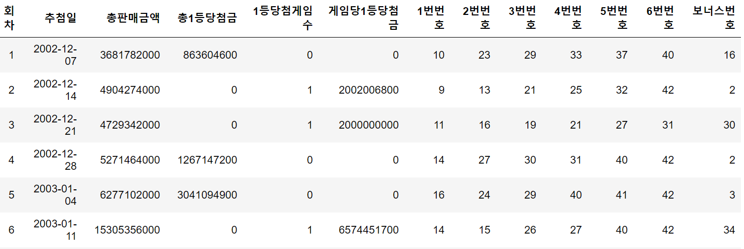 label = ['회차','추첨일','총판매금액','총1등당첨금','1등당첨게임수','게임당1등당첨금','1번번호','2번번호','3번번호','4번번호','5번번호','6번번호','보너스번호']
