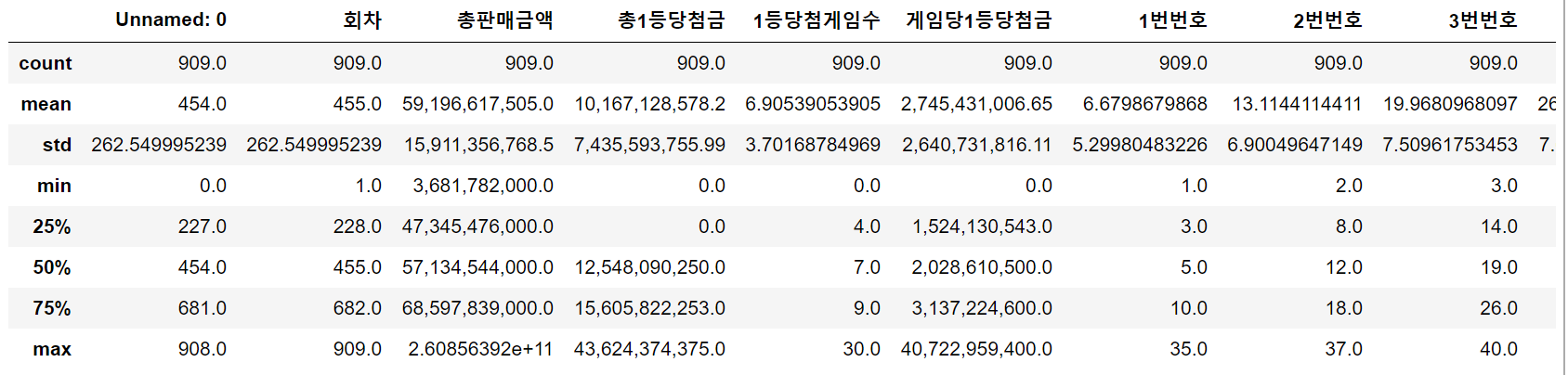 위에서 저장한 csv파일을 pandas로 불러와 확인한다. 결과는 아래와 같다. 회차, 추첨일, 번호 등등이 나온다. 1등 당첨 게임수가 1등을 당첨된 사람 수이다. 그 회에 1등이 없으면 다음회에 누적하여 돈을 준다!!!