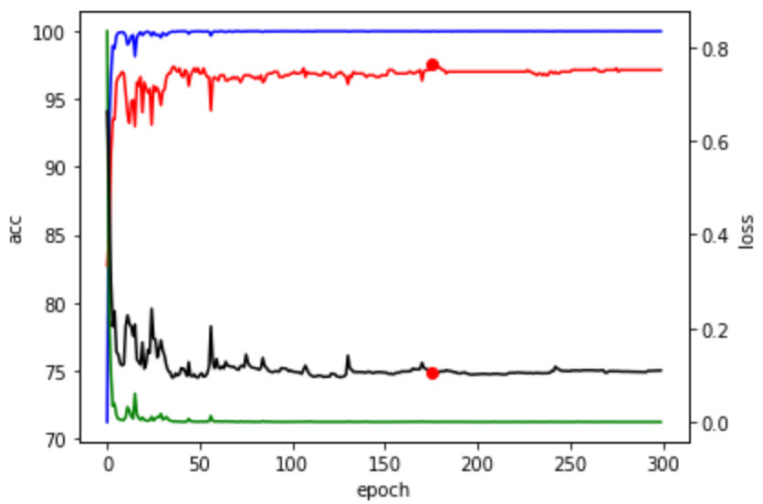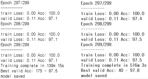 와, 길었다. 드디어 학습 시작! Teslar P100 한대로 2시간 가량 걸렸다. P100 4대를 사용해도 되지만 모델이 엄청 크지 않으면 그냥 1대로 돌리고 다른짓하다 확인하는게 정신건강에 좋다. 아무리 multi-gpu가 잘되있다 해도 4대를 최고효율로 돌리려면 이것저것 귀찮은 설정을 해야만 한다. 총 300 epoch을 수행했다. 그 중 175 epoch일 때 valid 데이터셋의 정확도가 97.5로 최고였다. 학습은 오래시킨다고 무조건 좋아지지 않는다. 오버피팅(Overfitting)이 일어나므로 꼭 꼭 학습 추이를 살펴봐야 한다.