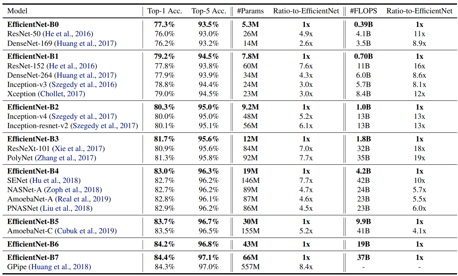 아래 그림을 보면 아! 이모델을 꼭 써야겠구나! 싶다. EfficientNet은 모델 사이즈 별로 B0~B7 버전이 있다. B0이 제일 가벼운 모델이다. 나는 IOT 디바이스에서 수행되는걸 중시 여기기 때문에 B0기준으로 보겠다. 동급 성능을 내는 ResNet-50, DenseNet-169보다 1/5, 1/2.6배 모델이 작다. B4부터는 파라미터가 커져도 크게 성능 향상이 없어서 고성능을 요할땐 B4 모델을 선택해야 겠다. 아무튼 겁나 빠른데 또 좋다는 뜻!