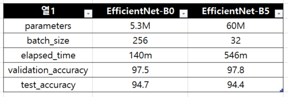B5 모델은 94.4%였다. train, validation의 성능은 더 좋았지만 test 데이터에 대해서는 오히려 가벼운 b0 모델보다 떨어졌다. 즉, 모델이 크기만 하다고 무조건 좋은건 아니다.