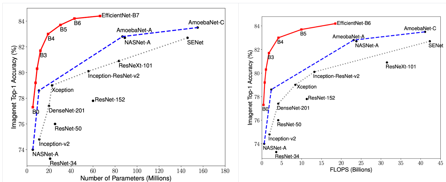 EfficientNet은 최근 ImageNet 대회에서 가벼운 모델로 최고 성능을 냈다. AutoML and Compound Scaling를사용하여이전 모델들 보다 훨씬 작으면서도 빠르다. 아래 그래프를 보면 유명한 ResNet-152 모델보다 성능이 좋은 EfficientNet-B1은 ResNet에 비해 파라미터가 1/5 수준이다. 성능을 높이는데 집착하여 모델을 깊고 무겁게 쌓았던 옛날과 다르게 요즘은 IOT 장비에 포팅하기 위해 가볍게 만드는 추세이다. 실제 물체인식(Object Detection) 연구들도 워크스테이션에선 1초당 10FPS를 웃돌며 빠르고 잘 돌아가지만, 라즈베리파이에서는 간신히 1FPS를 기대하기 힘들고 Jetson Nano에서도 5fps를 간신히 이뤄낸다. 즉 연구들은 연구로 끝날 뿐 실제 적용하기 위해서는 이와같은 연구가 필수이다.