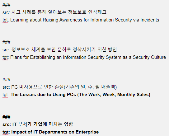 4-shot의 결과입니다. HyperCLOVA로 번역을 해보며 느낀 건 생성된 번역데이터도 의미 있지만, 그 뒤에 비슷한 src와 tgt의 문장 쌍이 생성됩니다. 이를 통해서 번역모델을 개발하기 위한 데이터 증강(augmentation)에 사용하면 적은 데이터를 많이 늘리는데 유용하게 쓰일 수 있을 거 같습니다.