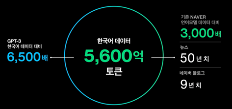 HyperCLOVA는 한국어 뉴스 50년 치, 네이버 블로그 9년 치로 구성한 한국어 코퍼스로 학습했습니다. 5,600억 토큰 규모인데, BERT 학습데이터인 33억 단어와 비교하면 대략 100배(토큰과 단어는 다른 단위이므로) 이상의 많은 데이터로 학습했습니다. 개인적인 실험에서 33억 단어는 대략 20G의 텍스트 파일로 구성되는데 학습데이터 텍스트 파일만 대략 20TB 정도 되겠네요. 와..