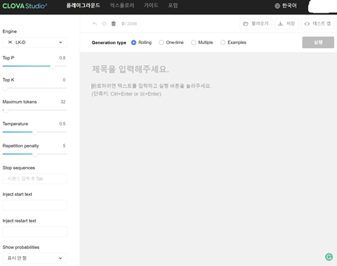 HyperCLOVA는 위 사이트에서 사용할 수 있습니다. 한국어 GPT3를 체험할 수 있는 플레이그라운드입니다.