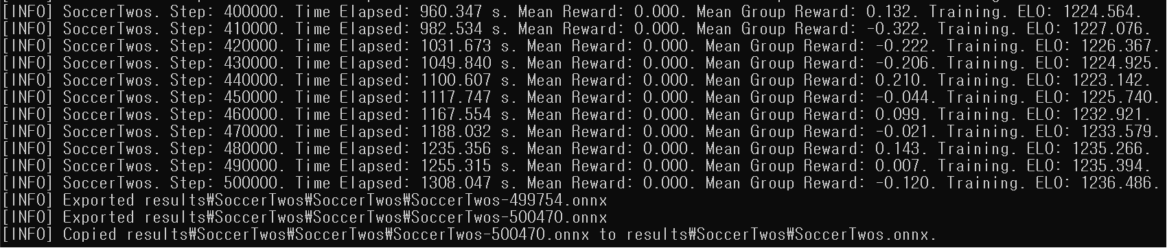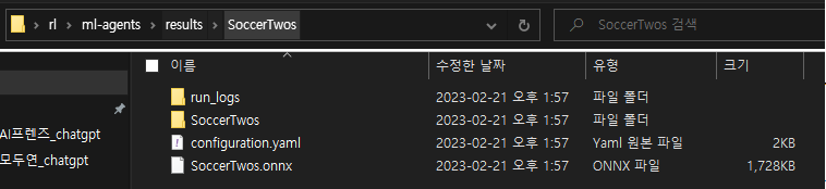 - results/SoccerTwos 폴더에 'SoccerTwos.onnx' 파일 생성
