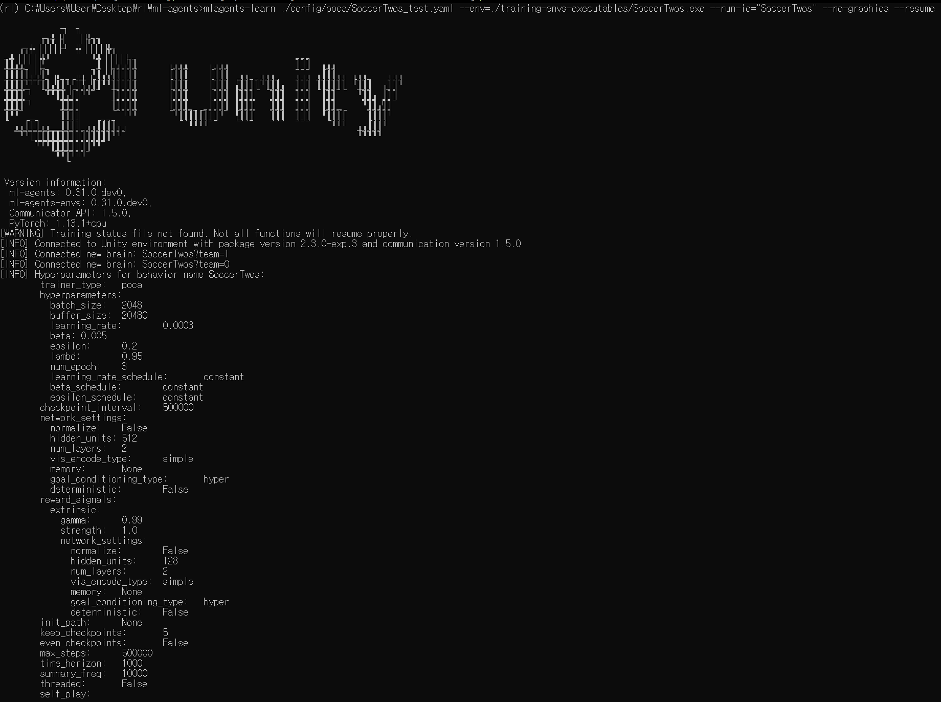 - Unity의 mlagents-learn을 실행시키고 2:2 축구 환경을 실행할 수 있도록 셋팅
