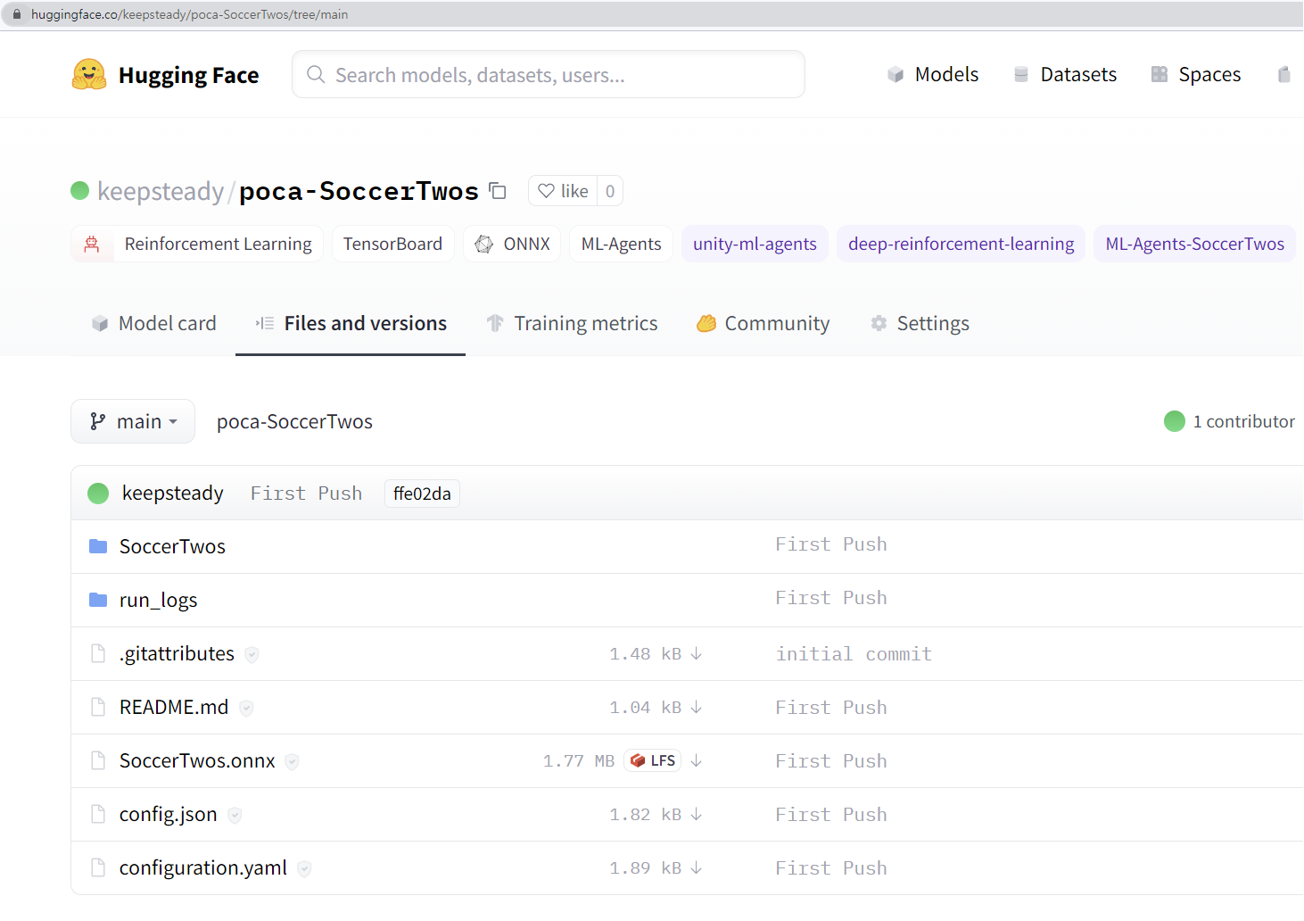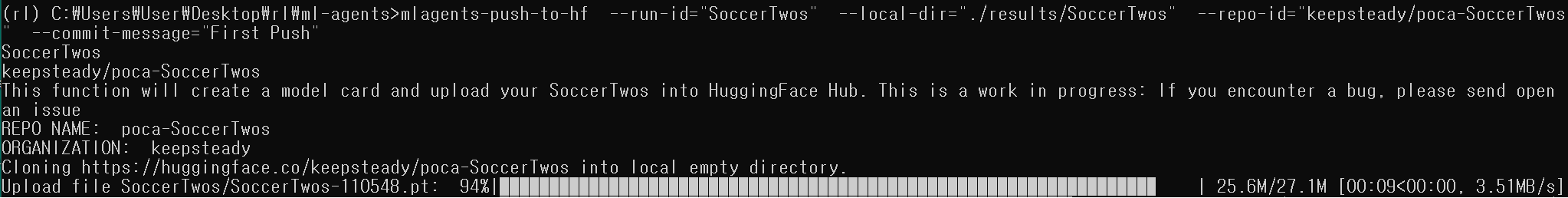 >> (예시)mlagents-push-to-hf --run-id="SoccerTwos" --local-dir="./results/SoccerTwos" --repo-id="keepsteady/poca-SoccerTwos" --commit-message="First Push"