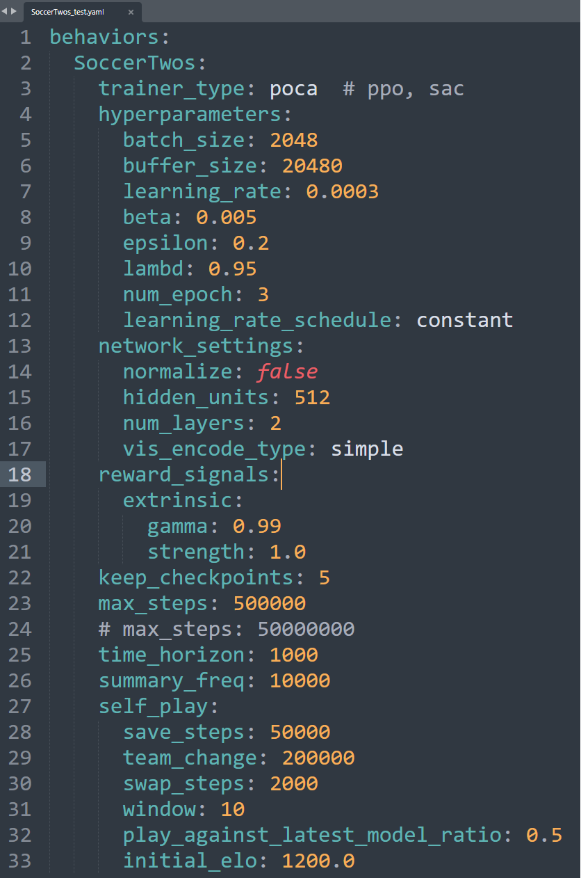 - trainer_type: poca, ppo, sac 3가지 중 선택, poca 성능이 제일 월등